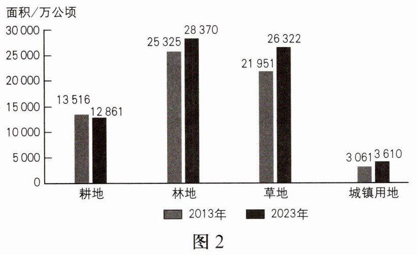 土地资源是人类赖以生存的基本资源之一,图2为中国四类土地利用类型2013与2023年面积对比图,完成5-7题。