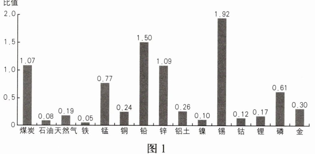 截至 2023 年底,我国已发现矿产 173 种,其中 45 种矿产的储量居世界前列。图 1 为部分矿产资源中国人均探明储量与世界人均探明储量的比值。读图,完成 1 - 2 题。
