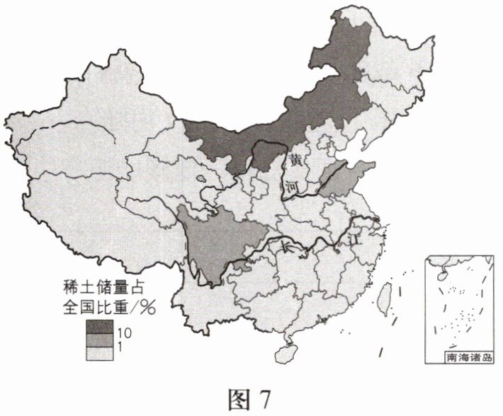 (1)读图可知,我国稀土资源地区分布不均,北多南少。