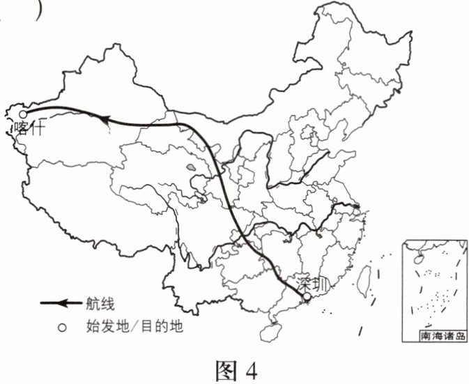 深圳—喀什航线是目前深圳始发飞行距离最长的境内直飞航线,单程飞行时间6个多小时,该航线促进了两地的交流和经济发展。图4为深圳—喀什航线示意图。据此完成4-5题。