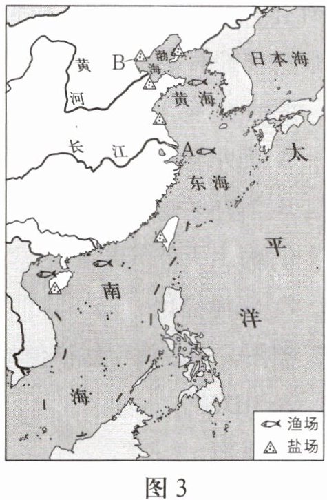 6. 我国是一个海洋大国,海洋资源丰富。海上风力大,风能资源丰富,但是开发难度大。近些年来,舟山渔场原来很丰富的大黄鱼、小黄鱼等都难以形成渔汛。图3为中国及毗邻海域主要海洋资源分布图。读图,完成下列问题。