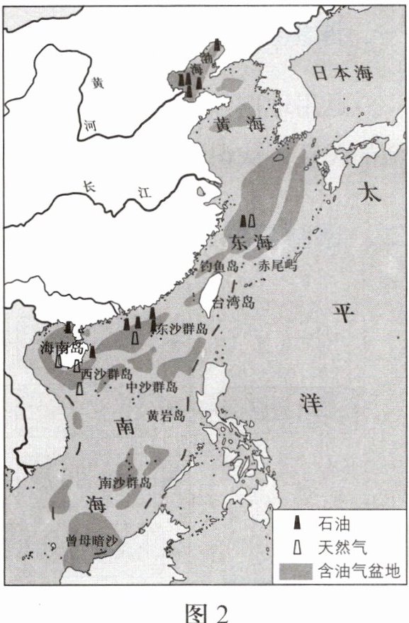 钓鱼岛及其附属岛屿是我国固有领土,其附近有丰富的油气资源。读中国及毗邻海域油气资源分布示意图(图2),完成4-5题。