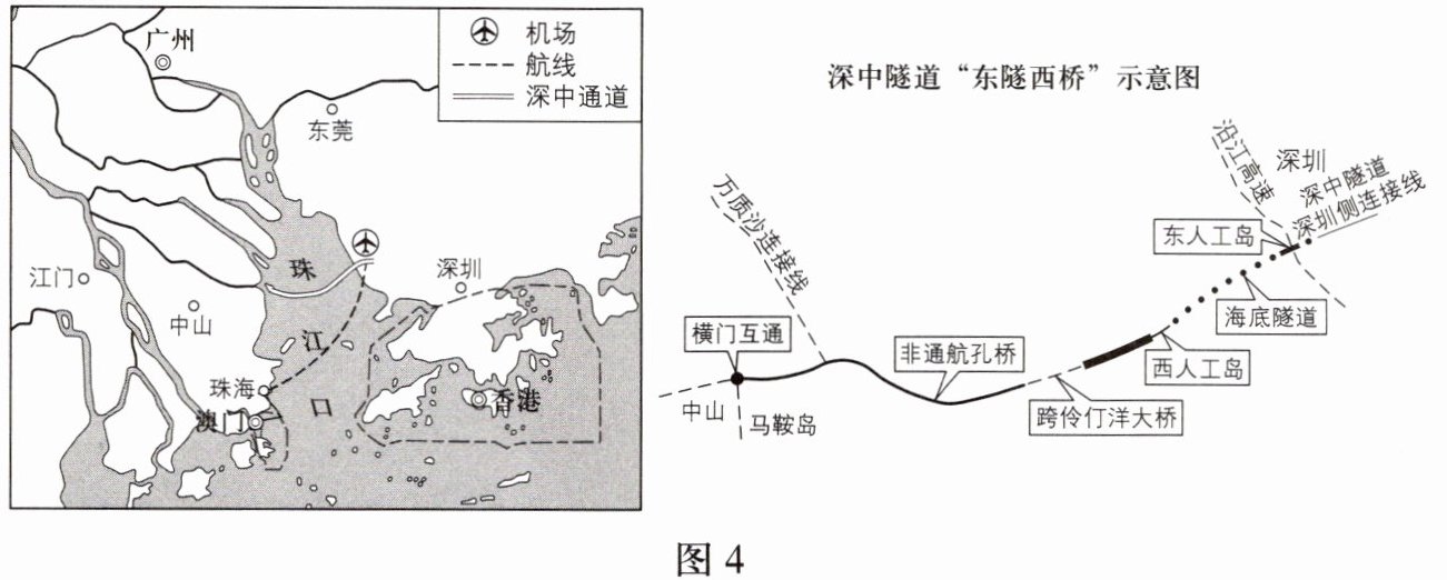 2023年年底,深中通道主线全线贯通。深中通道是连接深圳至中山的跨海通道,是集“桥、岛、隧、水下互通”于一体的跨海集群工程。通道采用“桥隧结合”的建设方案,其中西段为桥梁、东段为隧道。图4为珠江三角洲和深中通道主体工程示意图。读图,完成1-3题。