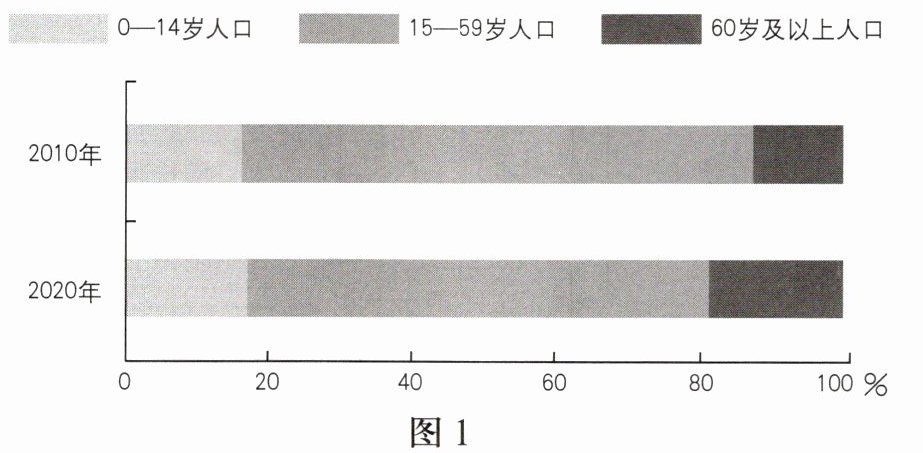 图 1 为中国 2010 年和 2020 年的人口年龄结构图。读图,完成 3 - 4 题。