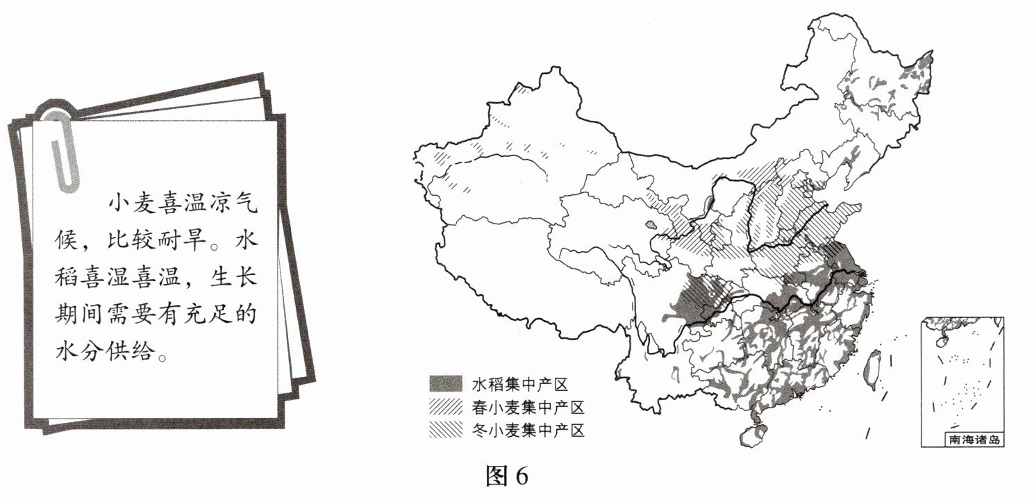 5. 世界风云变化多端,粮食安全问题越来越突出。图6为小麦和水稻生长习性资料卡和中国小麦、水稻主要分布示意图,读图,回答下列问题。