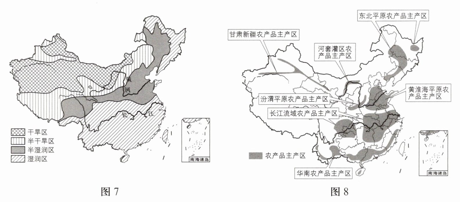材料二 图7为中国干湿地区分布图,图8为中国农产品主产区分布图。
