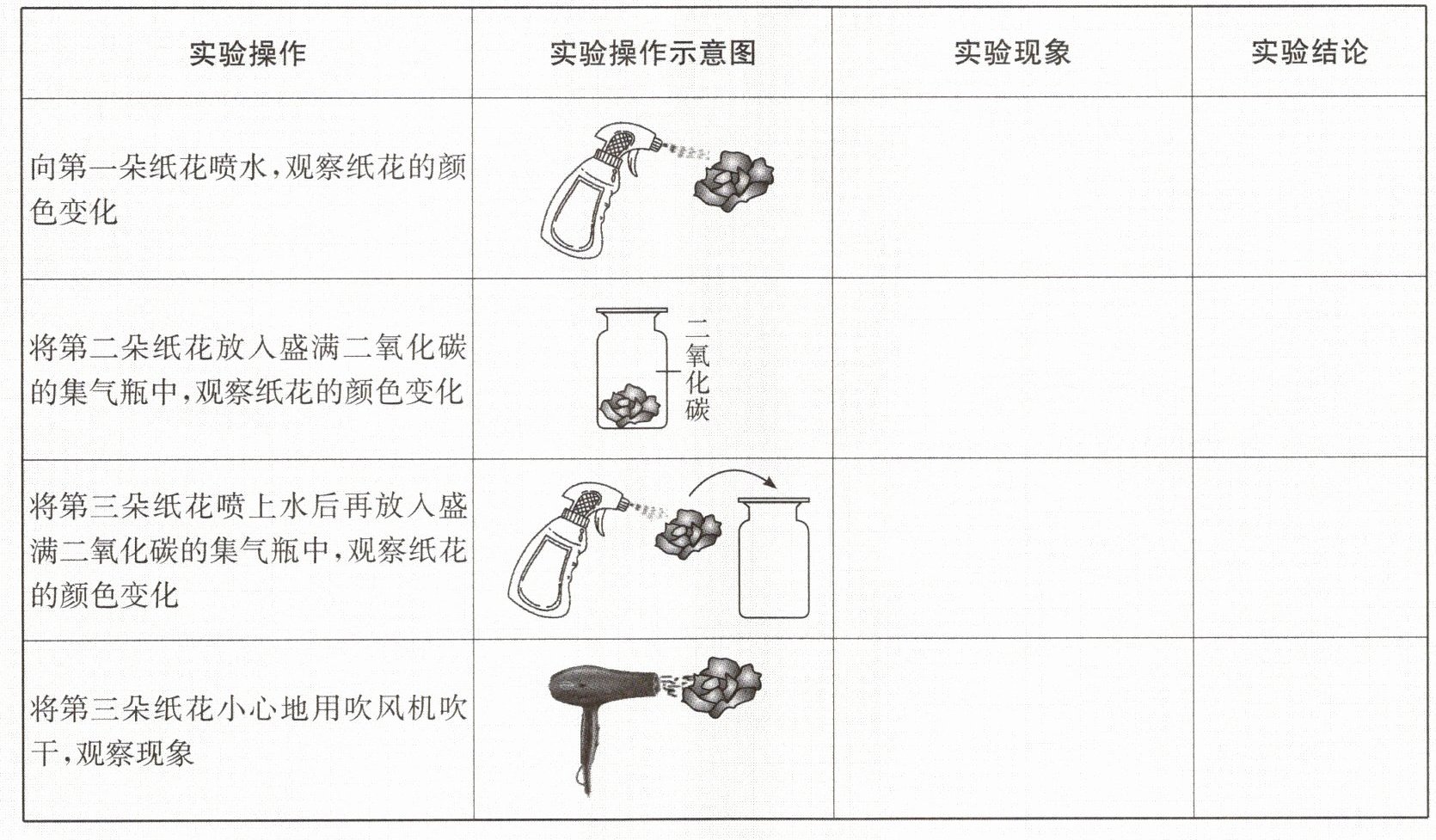 3.提示 纸花不变色 水不能使紫色石蕊变红 纸花不变色 干燥的二氧化碳不能使紫色石蕊变红 纸花变红 二氧化碳和水反应生成的新物质能使纸花由紫变红 纸花由红变紫 二氧化碳和水反应生成的新物质不稳定