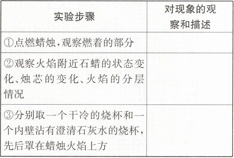 1.提示 火焰分为三层,外焰最明亮,内焰最暗 火焰附近石蜡由固态变为液态;烛芯焰心部分基本不变色而外焰部分炭化变黑;火焰分为外焰、内焰和焰心 干冷的烧杯内壁有水雾产生,澄清石灰水变浑浊