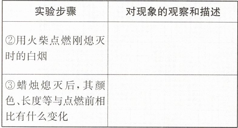 3.提示 吹灭蜡烛,立即将一块干而冷的玻璃片放在白烟上,玻璃片上没有出现水雾,说明白烟不是水蒸气;吹灭蜡烛,立即用燃着的木条去点白烟(注意不要接触烛芯),发现白烟燃烧继而将蜡烛重新点燃,说明白烟具有可燃性,是石蜡蒸气冷凝成的石蜡固体小颗粒。