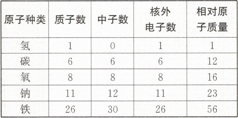 1.提示 铝原子的相对原子质量约为$\frac{4.482×10^{-26}\ kg}{1.993×10^{-26}\ kg×\frac{1}{12}}≈27$。