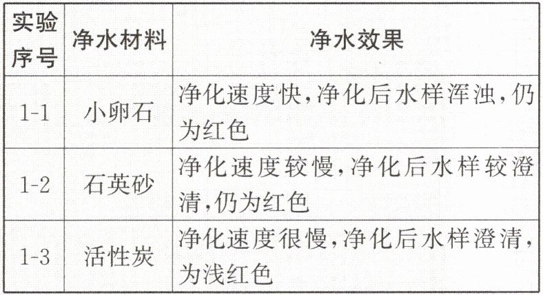 实验1:分别用等量不同净水材料填入装置中(如图1),对100mL河水(预先滴入1滴红墨水)进行净化。实验记录如下:
