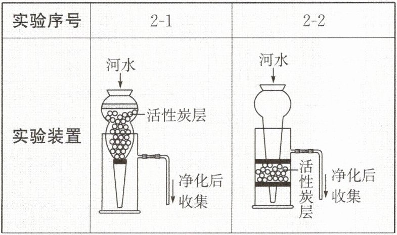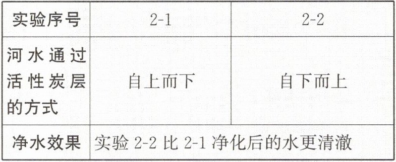 实验2:分别将相同流量的河水注入填充等量活性炭的净化装置。实验记录如下: