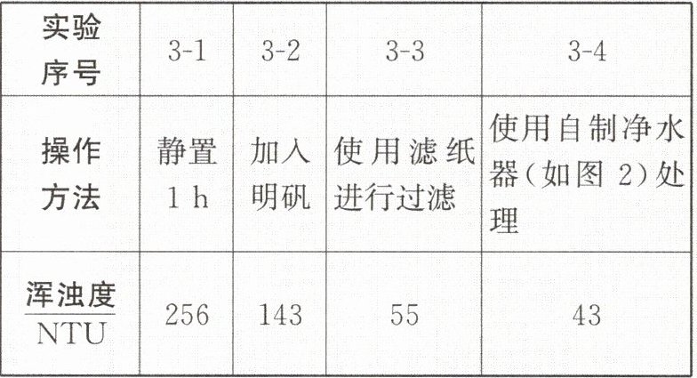 实验3:取100mL河水,测定初始水样的浑浊度为670NTU。采用图2装置,使用不同的操作方法分别对100mL水样进行处理,再测定水样的浑浊度。实验记录如下: