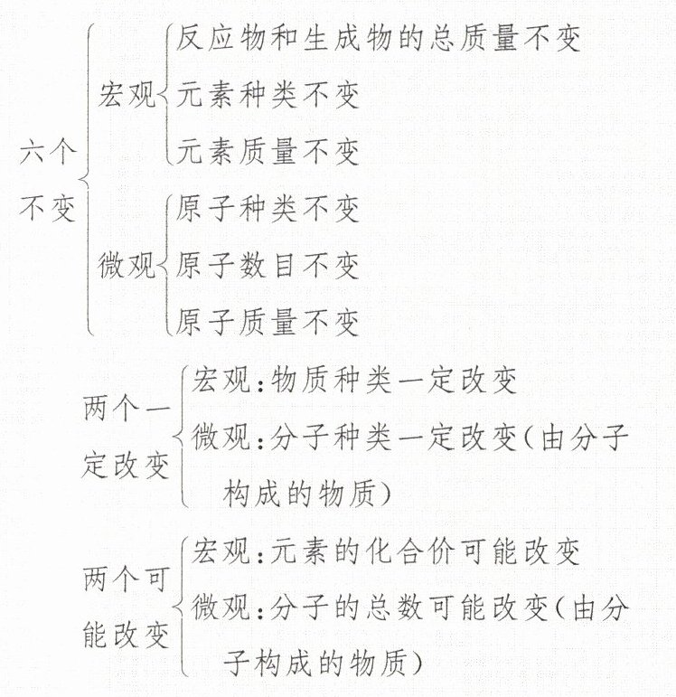 (2) 微观上:化学反应前后原子的种类没有改变,数目没有增减,原子本身的质量也没有改变,所以化学反应前后物质的质量总和必然相等。