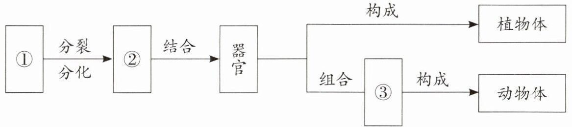 1. 概念框架图可以形象地反映生物学概念间的关系。下图是某同学学习了本章知识后画出来的生物体结构层次的概念框架图,其中①、②、③分别表示(