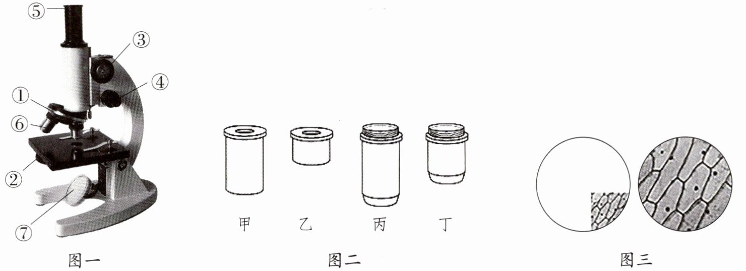 5. 某同学在实验室利用显微镜进行观察,图一是显微镜的结构图,图二显示该显微镜配备的四个透镜,图三是显微镜下看到的物像,据此回答下列问题 ([ ] 内填写图中序号或文字)。