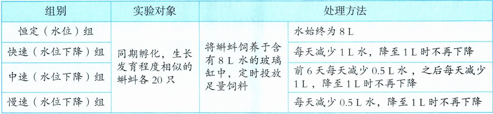 11. 全球变暖会影响两栖类的生长发育吗?科研人员认为升温加快了两栖类栖息地的干涸速度,因此他们通过模拟实验探究自然状态的水位变化对蝌蚪生长的影响。实验处理方法如下表所示。