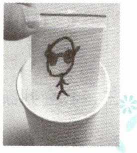 实验方法:在白纸上用红色记号笔画上眼镜,然后将其放在透明塑封袋里。拿黑色记号笔在塑封袋外面画一个小人,将塑封袋放入水中。