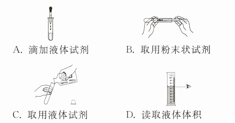 解析 胶头滴管伸入试管内易沾污胶头滴管,A项错误。取用粉末状试剂时,应先将试管横放,用药匙或纸槽把试剂送至试管底部,然后把试管竖立起来,B项正确。取用液体试剂时,瓶塞要倒放,细口瓶的标签要朝向手心,瓶口紧挨着试管口,C项正确。读取液体体积时,视线要与量筒内液体凹液面的最低处保持水平,再读数,D项正确。
