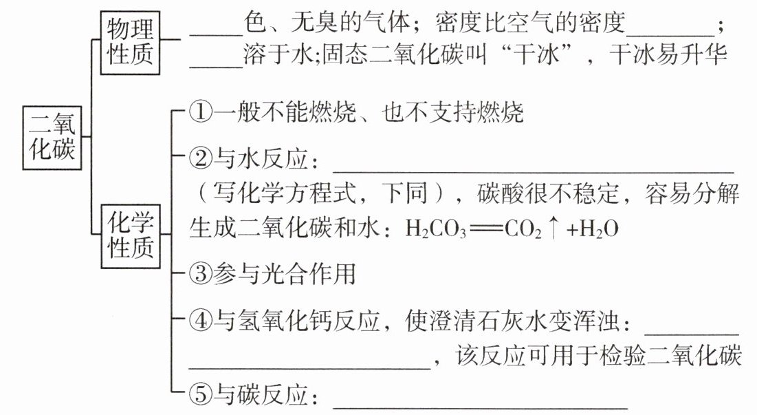 $\begin{cases}物理性质:无色、无臭的气体;密度比空气的密度大;能溶于水;固态二氧化碳叫“干冰”,干冰易升华 \\化学性质:$$\\\quad ①一般不能燃烧、也不支持燃烧 \\\quad ②与水反应:$