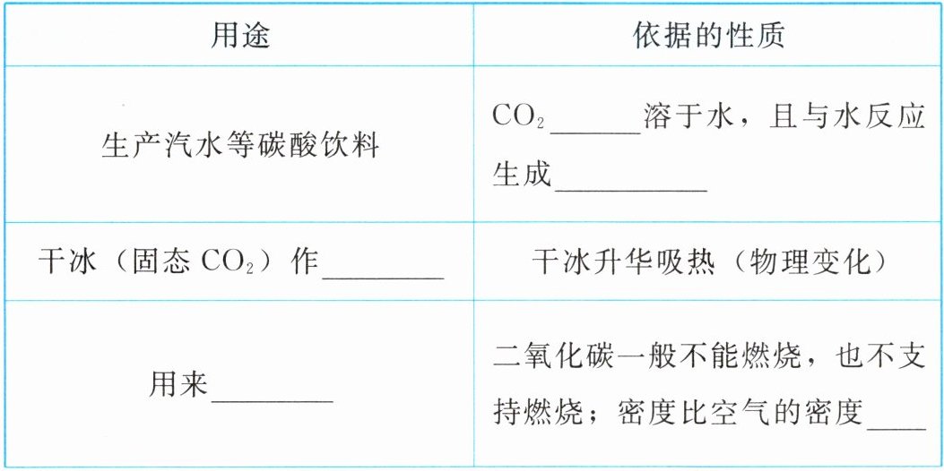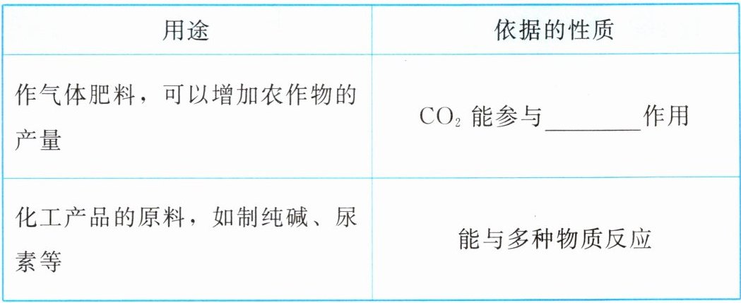 $CO_2 + C \stackrel{高温}{=\!=\!=} 2CO\end{cases}$(2) 二氧化碳的用途。