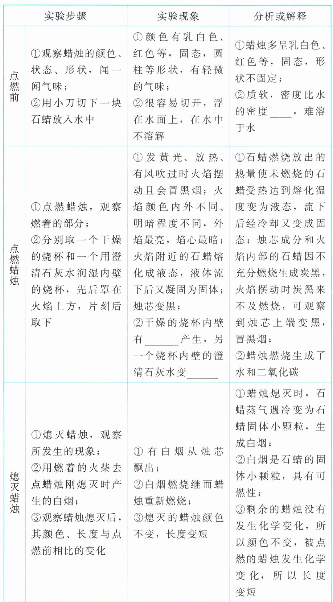 ③观察蜡烛熄灭后,其颜色、长度与点燃前相比的变化|①有白烟从烛芯飘出;