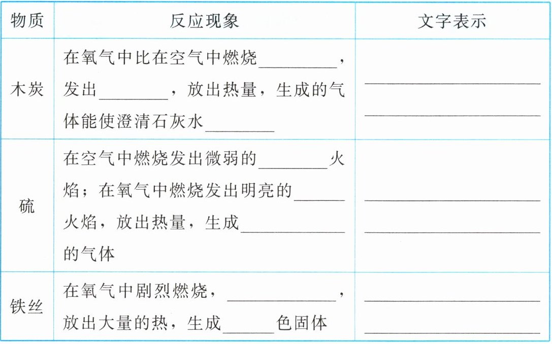 4 更剧烈 白光 变浑浊 碳+氧气$\stackrel{点燃}{→}$二氧化碳 淡蓝色 蓝紫色 有刺激性气味 硫+氧气$\stackrel{点燃}{→}$二氧化硫 火星四射 黑 铁+氧气$\stackrel{点燃}{→}$四氧化三铁