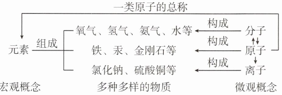 元素$\xrightarrow{组成}$$\begin{cases}氧气、氢气、氨气、水等\xleftarrow{构成}分子\\铁、汞、金刚石等\xleftarrow{构成}原子\\氯化钠、硫酸铜等\xleftarrow{构成}离子\end{cases}$$\xrightarrow{一类原子的总称}$
