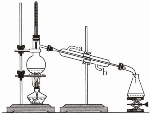 6.D 解析 A项,需要先通冷却水,后加热蒸馏烧瓶,若先加热蒸馏烧瓶,蒸气不能得到充分冷凝,且冷凝器温度过高,通入冷却水时易发生炸裂,错误。B项,实验时,冷却水的流向应与水蒸气的流向相反,从而达到较好的冷凝效果,因此冷凝管进、出水的方向是b进a出,错误。C项,蒸馏时需控制的温度是出口水蒸气的温度,因此温度计的水银球应在蒸馏烧瓶的支管口处,错误。D项,加热蒸馏烧瓶必须垫陶土网,以免蒸馏烧瓶受热不均而炸裂,正确。