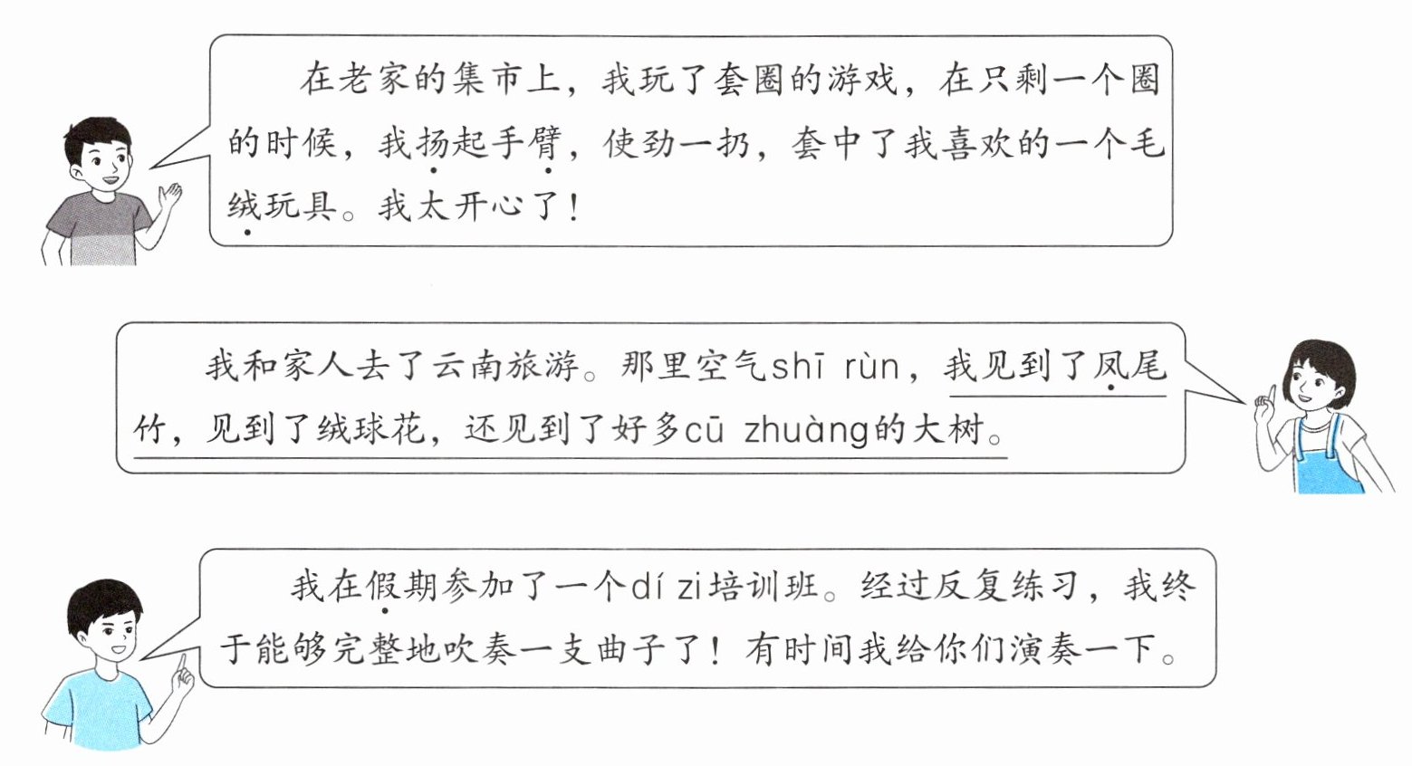 一、同学们分享了自己暑假中的一些新鲜事,读一读,完成练习。