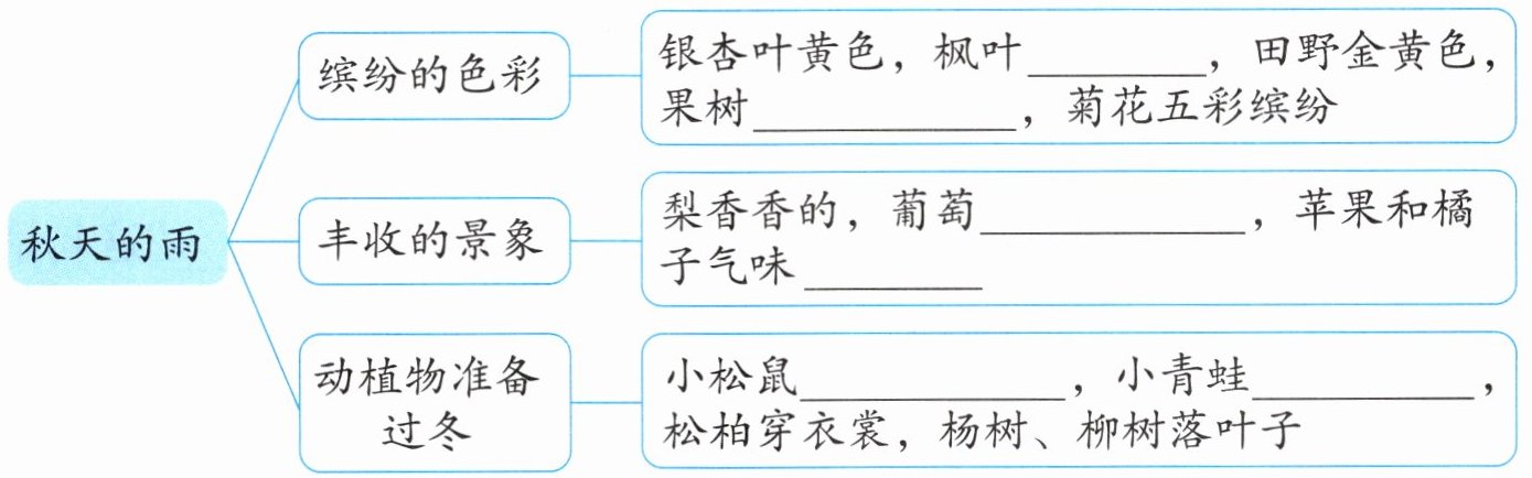 秋姑娘带着一把神奇的钥\underset{\cdot}{匙},打开了秋天的大门,给人们送来清 liáng。果园里,一片\underset{\cdot}{缤}纷的丰收画卷。金黄的香\underset{\cdot}{梨}散发着诱人的香气,引得人们凑近去闻。秋风吹起了小\underset{\cdot}{喇}叭,告诉小动物们,冬天快要来了。松鼠们忙着在树上 wā洞,储存过冬的食物。五彩斑斓的落叶从枝头飘落,有枯黄的、淡黄的、通红的、淡红的,深深浅浅,各种颜色,美丽极了。