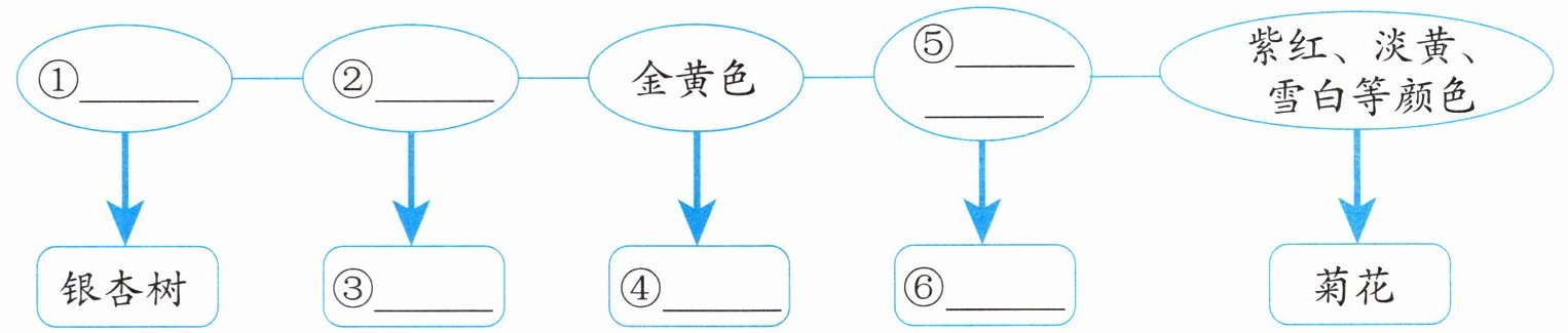 1.秋天的雨,有一盒五彩缤纷的颜料。 2.①黄色 ②红色 ③枫树 ④田野 ⑤橙红色 ⑥果树 3.人 在秋雨里轻轻摆动 喜爱 4.示例:紫色 葡萄 紫红紫红的葡萄像一颗颗宝石,闪哪闪哪,闪出了秋天的甜蜜