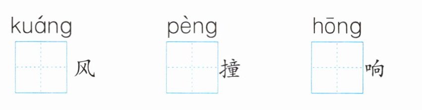 ,在沙滩上尽情奔跑,感受着这份舒适。但天公不作美,傍晚 kuáng 风骤起,海浪 pèng 撞着岩石,发出吓人的 hōng 响,我躲在房间里,想象大海里正进行着一场殊死的搏斗。1. 用“√”画出加点字的正确读音。