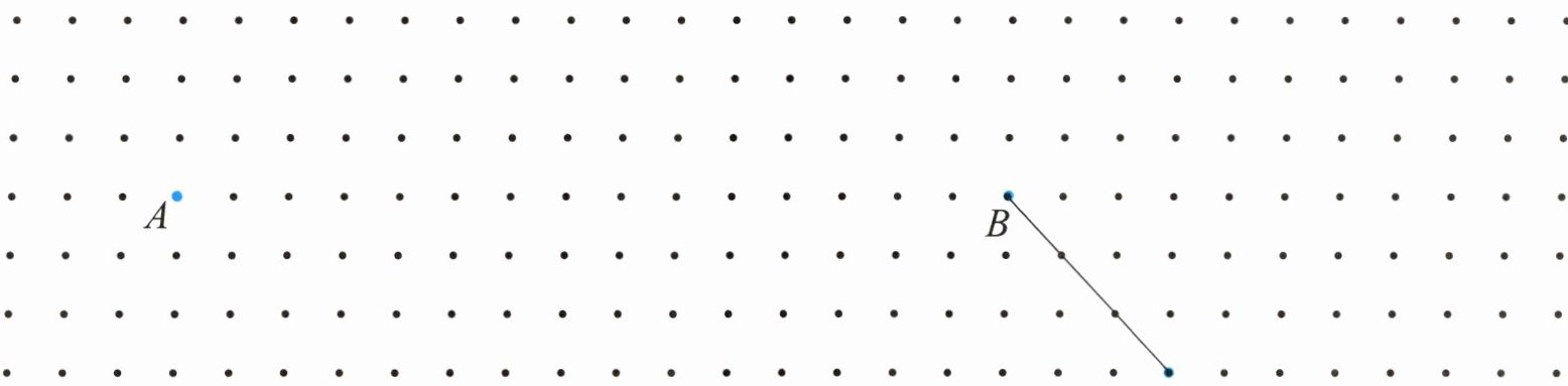 从点 $A$ 向上(或向下)沿点子图的垂直方向画一条直线,与从点 $A$ 向右(或向左)沿点子图的水平方向画一条直线,形成一个直角,以给定的点$B$的一条边为基准,沿垂直方向画出另一条边,使其与给定边形成直角(可以利用点子图的网格线辅助,确保两条边相互垂直)。