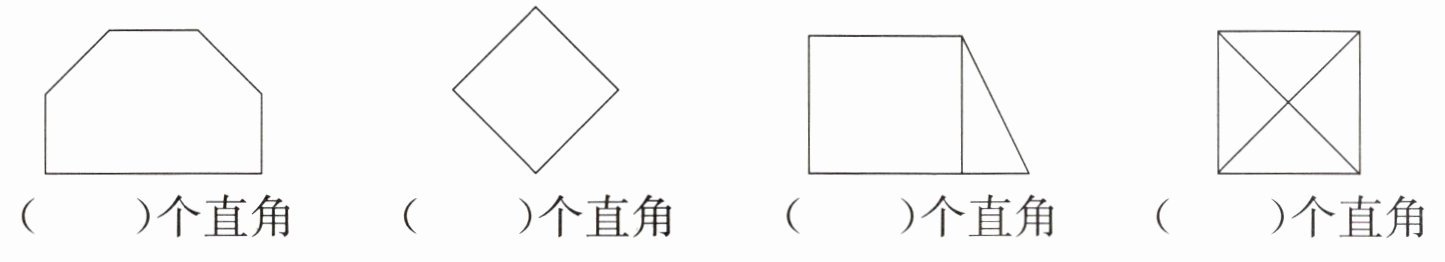 2. 数一数下面的图形中各有几个直角,并用直角符号“┐”标出来。