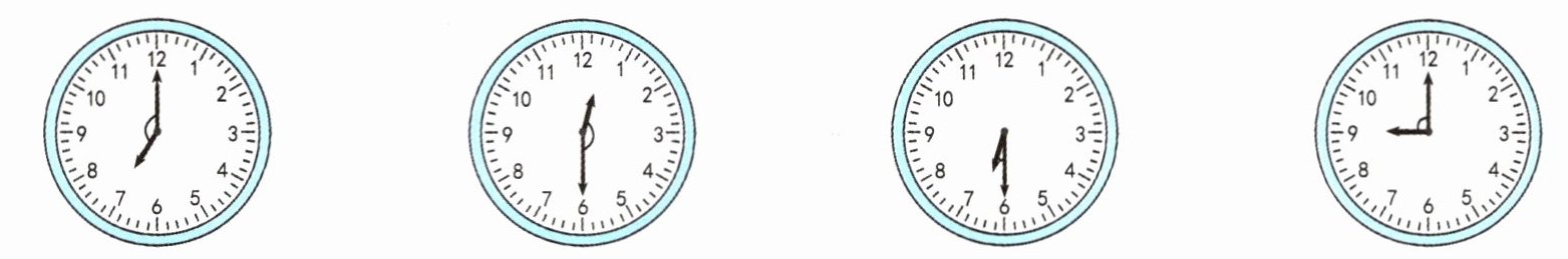 2. 下面钟面上时针和分针形成的角分别是什么角?填一填。