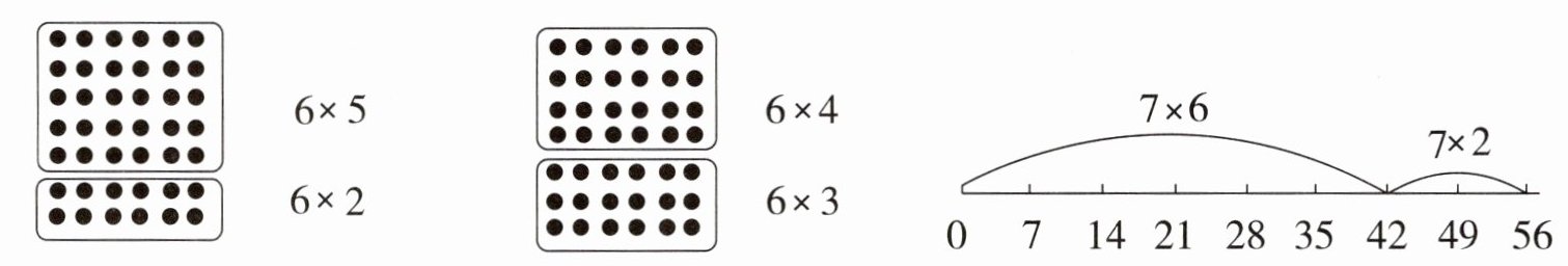 观察第三个图,$7×8$可以看作$7×(6 + 2)$,根据乘法分配律$a×(b + c)=a× b+a× c$(这里$a = 7$,$b = 6$,$c = 2$),所以$7×8=7×6+7×2$。