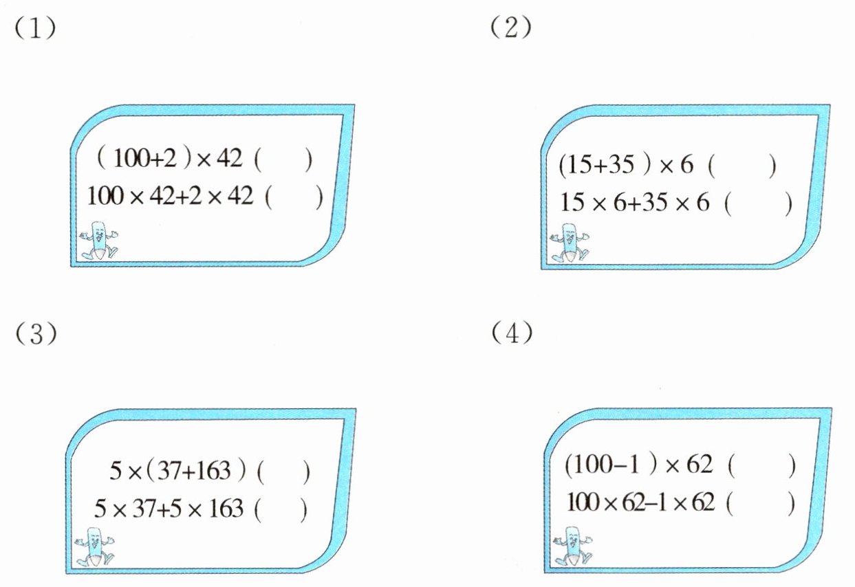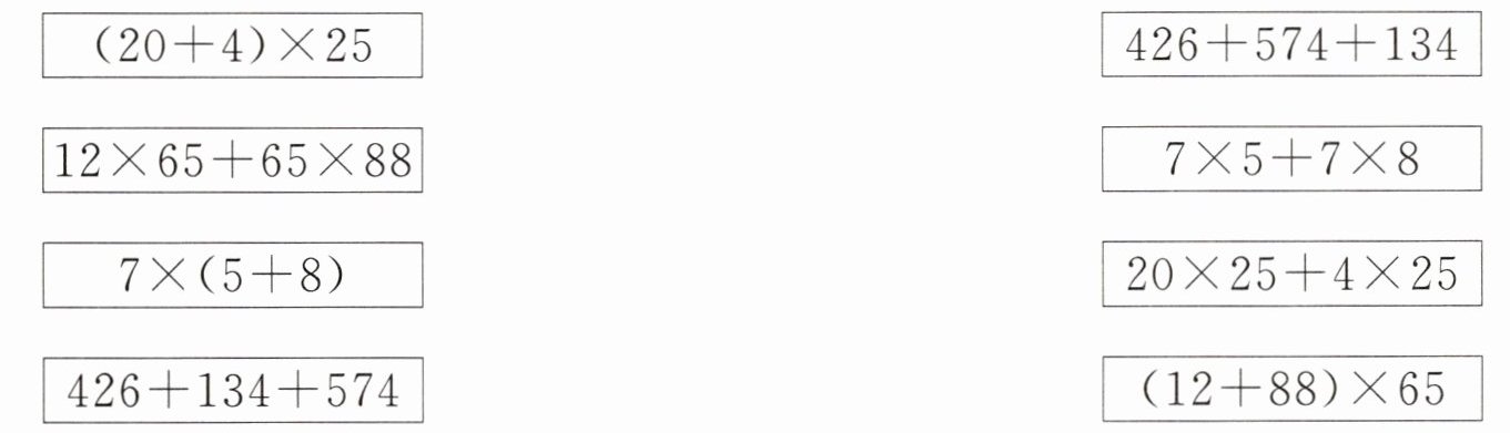(20+4)×25—20×25+4×25;426+574+134—426+134+574;12×65+65×88—(12+88)×65;7×5+7×8—7×(5+8)