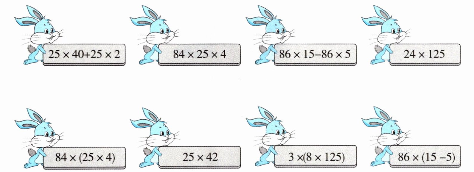 $25×40+25×2$连$25×42$;$84×25×4$连$84×(25×4)$;$86×15-86×5$连$86×(15-5)$;$24×125$连$3×(8×125)$