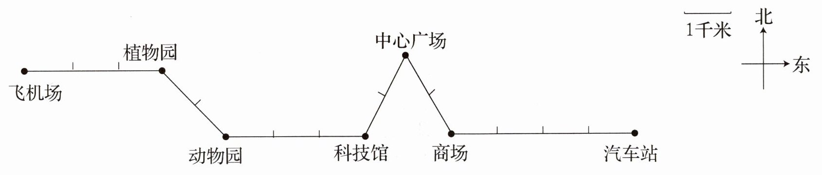 1. 从飞机场出发,向东行驶2千米到达植物园。