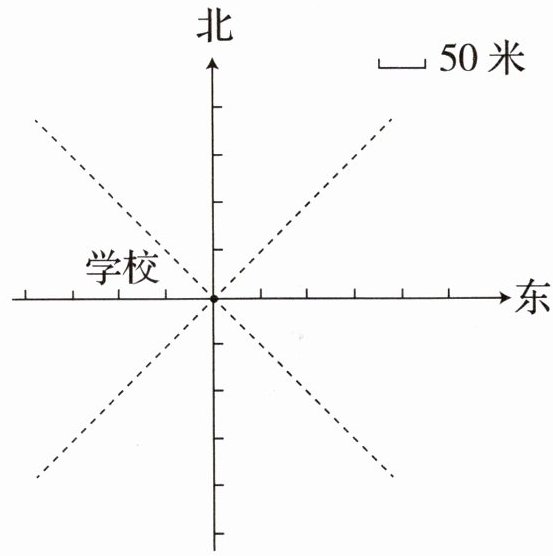 (1) 从学校向北沿正方向数3个单位(150米 ÷ 50米/单位 = 3单位),用“△”标出。