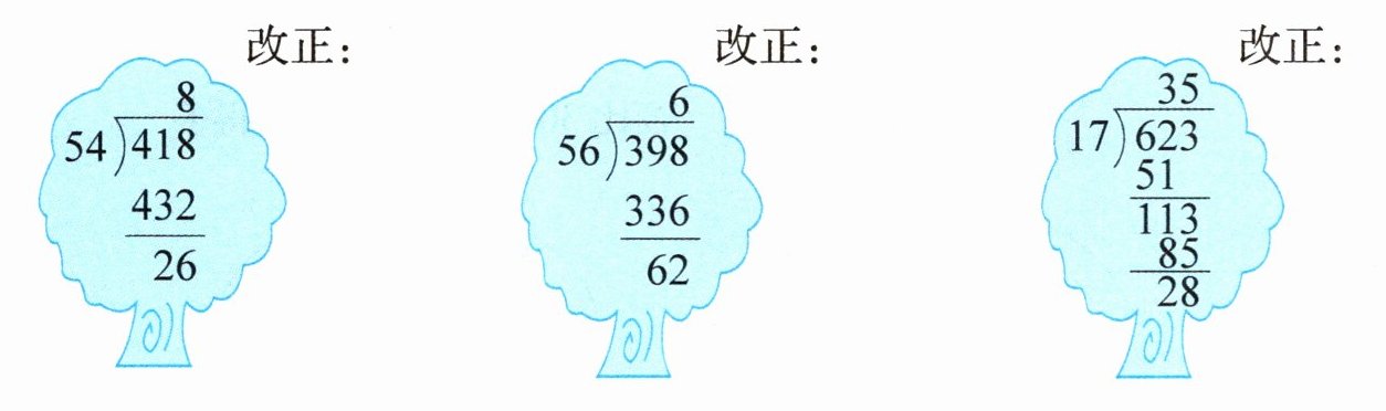 本题可根据整数除法的运算法则,分析每个竖式计算过程中的错误并改正。
