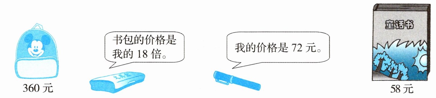 解:书包价格$360$元,钢笔价格$72$元,一共$360 + 72=432$(元)。(答案不唯一)