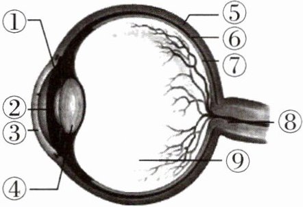 ,人们常说的白眼球,保护眼球的内部结构。⑥脉络膜,含有丰富的血管和色素,给视网膜提供营养,并使眼内形成一个“