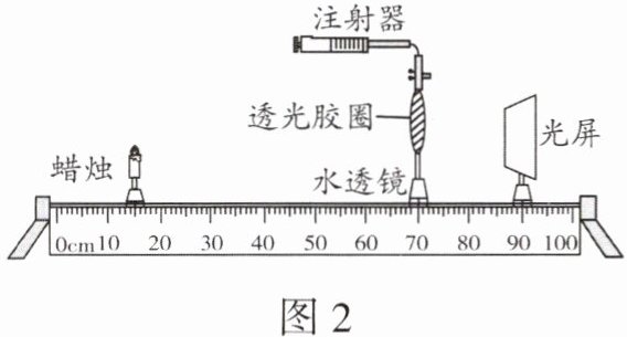 (4)多看绿色植物可以缓解眼部疲劳,预防近视。为了进一步研究视觉的形成,西西和同学制作了一个可变焦的水透镜,利用光具座及配件来模拟人的眼球成像过程,如图2所示。