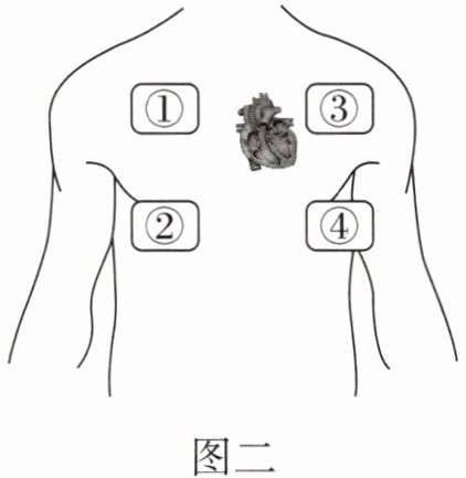 (3) 根据文中操作方法,使用AED时,两个电极片应分别贴在图二所示的