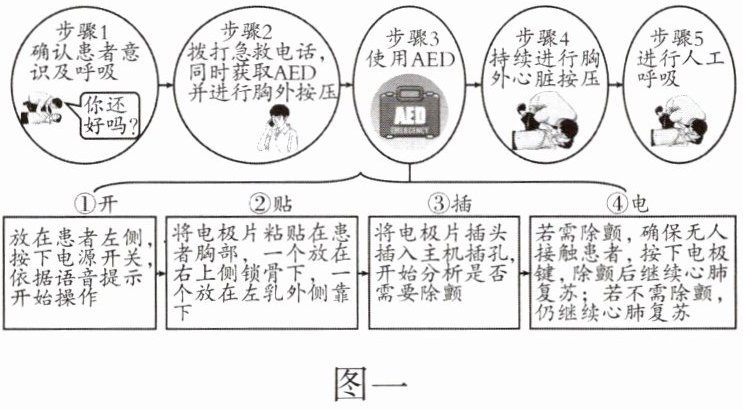 的呼吸中枢等基本生命活动中枢逐渐停止工作,危及人的生命。(3) 根据文中操作方法,使用AED时,两个电极片应分别贴在图二所示的