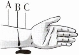 。(3)遇到外伤出血患者需及时止血,若受伤部位B处有暗红色的血液缓缓流出(如图所示),则急救时加压或包扎的位点应在图中