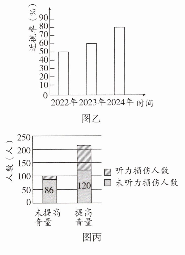 ;图丙是调查学生在嘈杂环境时是否提高耳机音量与听力损伤的情况统计,据此,研究人员提出了“在嘈杂环境中不建议提高耳机音量”的倡议,他们的依据是环境嘈杂时提高音量的人中听力损伤占比高于未提高音量的(或在嘈杂环境时未提高音量的人中听力损伤占比小)(或在嘈杂环境时提高音量的人中听力损伤占比大)