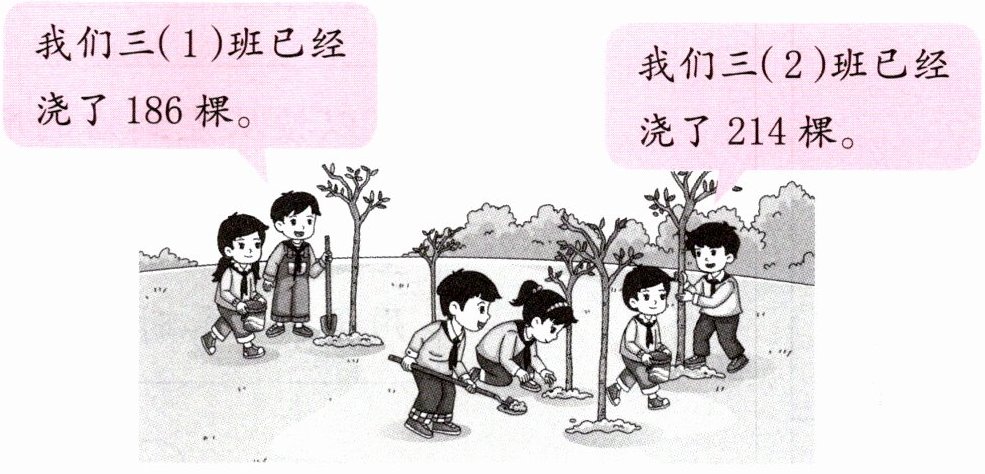 2. 三(1)班和三(2)班的学生要给500棵小树浇水。还有多少棵小树没有浇水?
